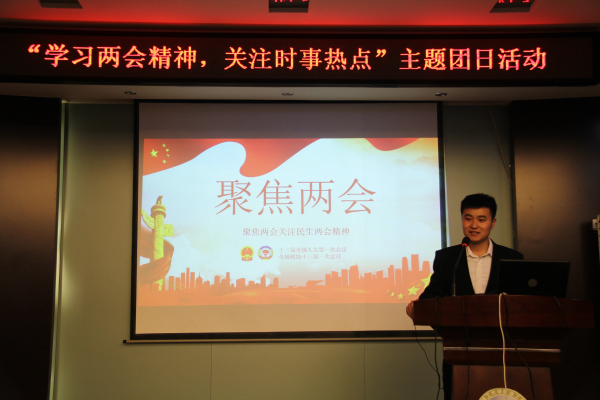 柴晨同学向大家介绍了"两会"的相关知识,使大家对"两会"有了充分的认识。与大家分享了两会中习近平总书记的"十大金句",他希望同学们通过认真研读这十大金句,感悟习近平总书记的要求和期待,创新思维,把握时光,不负韶华。最后,通过观看十三届全国人大一次会议开幕式的视频,同学们听取了李克强总理的2018政府工作报告,并对报告中所涉及的医疗、教育、住房、就业等民生话题有了一定的了解和认知。